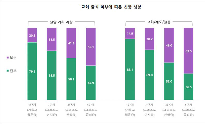 기독청년의 신앙 유형이 전반적으로 진보적 성향이 강한 것으로 나타났다. 여기서 신앙 진보란 ‘개인영성’보다 ‘사회참여’적인 신앙과, ‘교회중심’적인 신앙보단 ‘개인중심’의 신앙 형태를 더 선호하는 것을 의미한다.