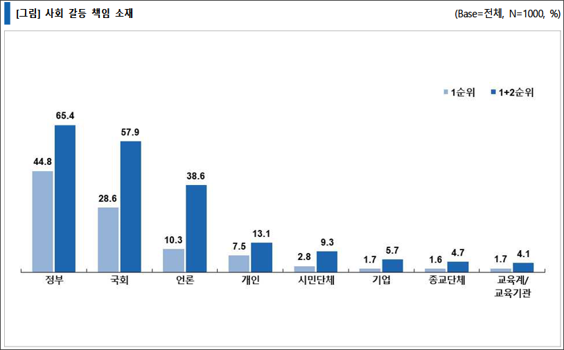 우리 사회 갈등의 책임은 누구/어디에 있는지, 책임 소재에 대한 인식을 물은 결과, ‘정부’에 있다는 응답이 1순위 및 1+2순위에서 모두 가장 높게 나타났고, 그 다음으로 ‘국회’, ‘언론’의 순으로 나타났다. 1순위 응답에서는 ‘정부’(44.8%)와 ‘국회’(28.6%)가 전체의 3/4 가량을 차지해, 정치권의 책임을 가장 크게 인식하고 있었다.