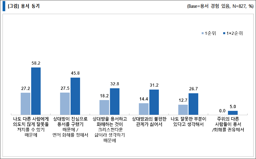특히 나에게 잘못한 사람을 용서하게 되는 계기는 ‘나도 다른 사람에게 의도치 않게 잘못을 저지를 수 있고’, ‘상대방이 진심으로 용서를 구했기 때문’인 것으로 나타났다.