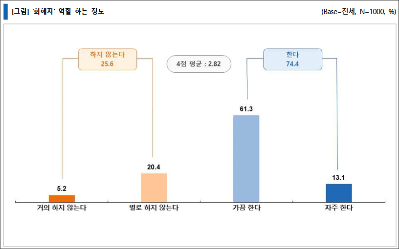 주위에 갈등이 일어났을 때 중재하는 '화해자 역할'을 하고 있는지에 대해 질문한 결과, 개신교인 4명 중 3명은 자신이 ‘화해자’ 역할, 즉, 주위에서 갈등이 일어났을 때 중재하는 역할을 하고 있다고 응답했다.