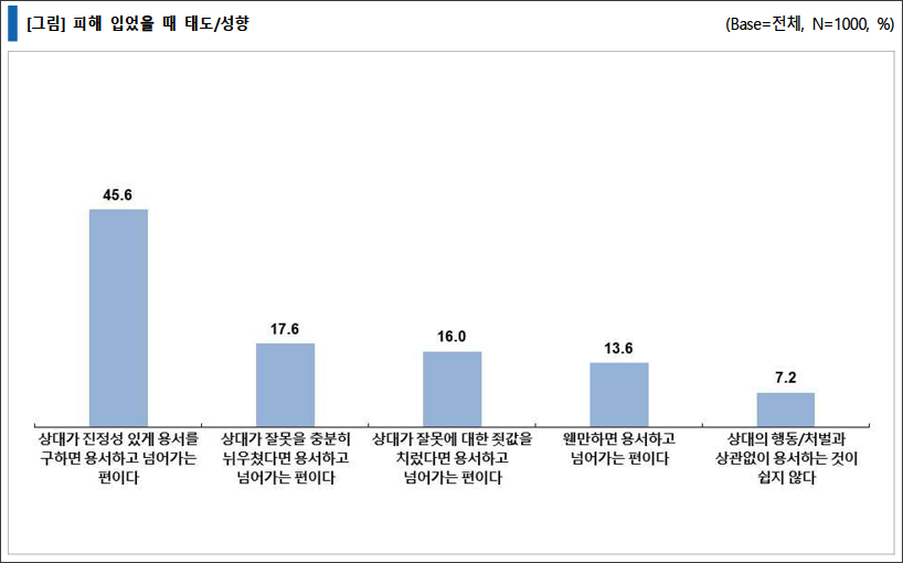 한국 교회 개신교인의 용서와 화해 인식 및 경험과 관련해서 '타인에게 피해를 입었을 때 어떤 성향을 보이는가?'라는 질문을 한 결과, ‘상대가 진정성 있게 용서를 구하면 용서하고 넘어가는 편’이라고 응답했다(45.6%).