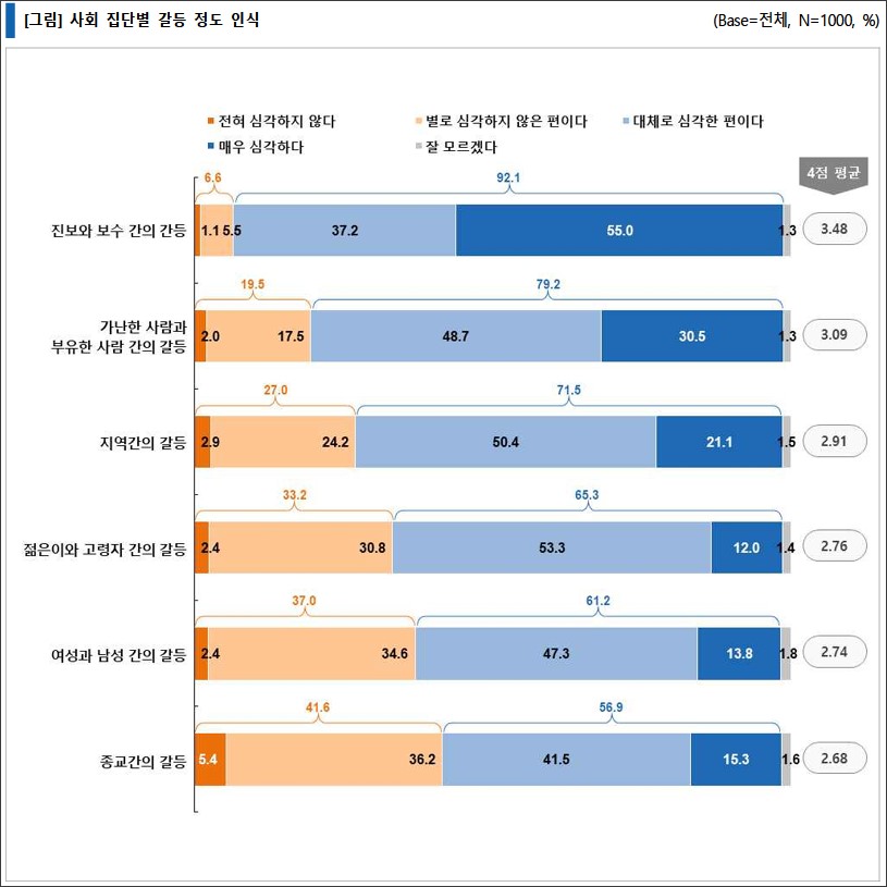 이밖에 ‘가난한 사람과 부유한 사람’, 즉, 경제적 차이에 따른 갈등이 심각하다는 인식이 79.2%, ‘지역 간 갈등’ 71.5%, ‘젊은이와 고령자 간의 갈등’ 65.3% 등으로, 3명 중 2명이 세대, 지역, 경제력, 이념에 따른 집단 간 갈등이 심각하다고 여기고 있었다.