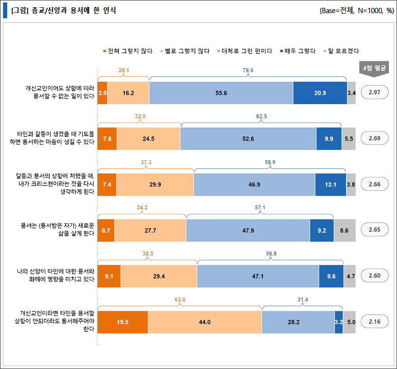 종교 및 신앙과 용서에 대한 몇 가지 문장을 제시하고 동의 정도를 물은 결과, 동의율(대체로+매우 그렇다)이 가장 높은 항목은 ’\'개신교인이어도 상황에 따라 용서할 수 없는 일이 있다'(76.6%)로, 무조건적인 용서는 지양하는 모습을 보였다.