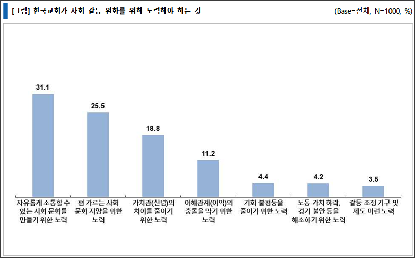 또한 한국 교회가 사회 갈등 완화를 위해 어떤 노력을 해야하는지에 대해서는 ‘자유롭게 소통할 수 있는 사회문화를 만들기 위한 노력’이 31.1%로 가장 많이 꼽혔고, 그다음으로 ‘편 가르는 사회 문화 지양을 위한 노력’(25.5%)이 꼽혔다.
