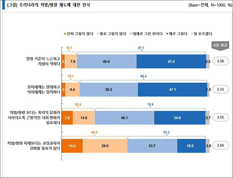 특히 우리나라의 죄에 대한 처벌/형량 제도에 대한 인식을 조사한 결과, '양형 기준이 느슨하고 처벌이 약하다' 및 '강자에게는 관대하고 약자에게는 엄격하다'에 대해서 각각 87.7%, 86.4%가 동의(대체로 그런 편+매우 그렇다) 의견을 보여, 공평하지 못한 양형 기준과 전반적으로 약한 처벌에 대해 대부분이 공감하고 있었다.