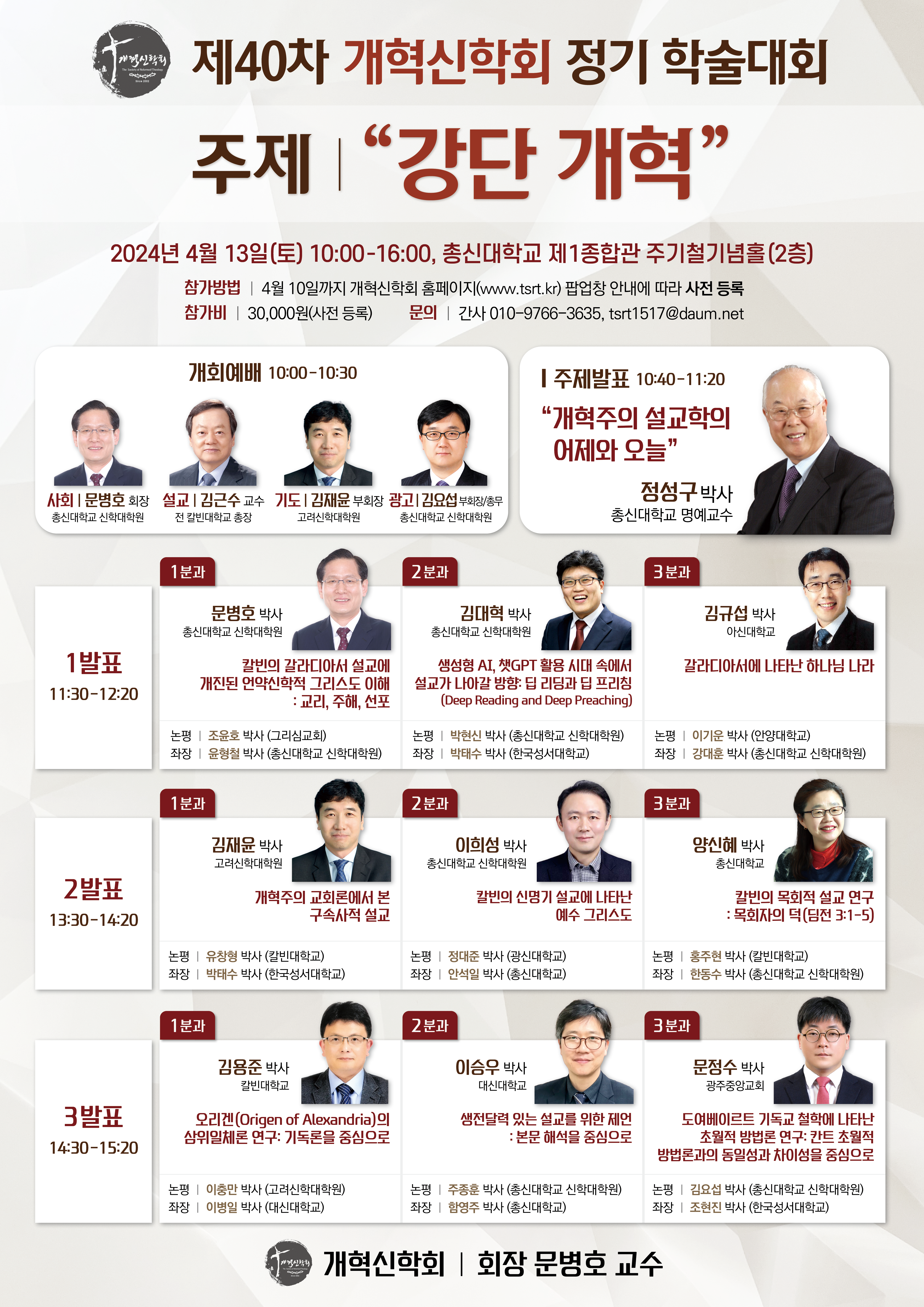 개혁신학회(회장:문병호 박사, 총신대 신대원 교수)가 오는 4월 13일(토) 오전 10시 총신대 제1종합관 주기철기념홀에서 제40차 정기학술대회를 개최한다.