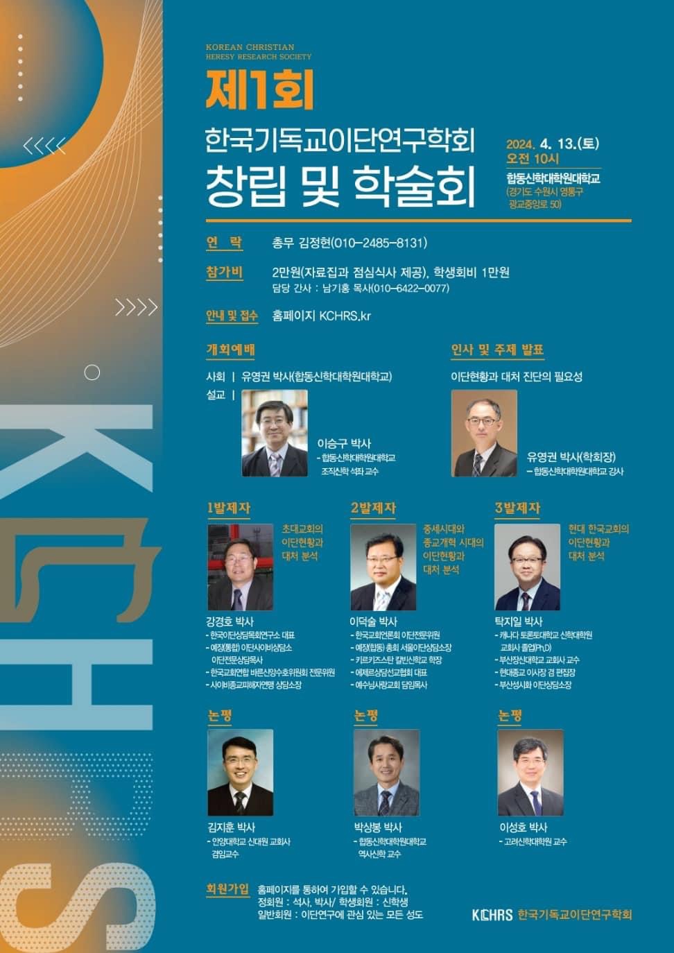 한국기독교이단연구학회(회장:유영권 박사)가 창립을 기념해 오는 4월 13일(토) 오전 10시 합동신학대학원대학교에서 '제1회 학술회'를 개최한다.