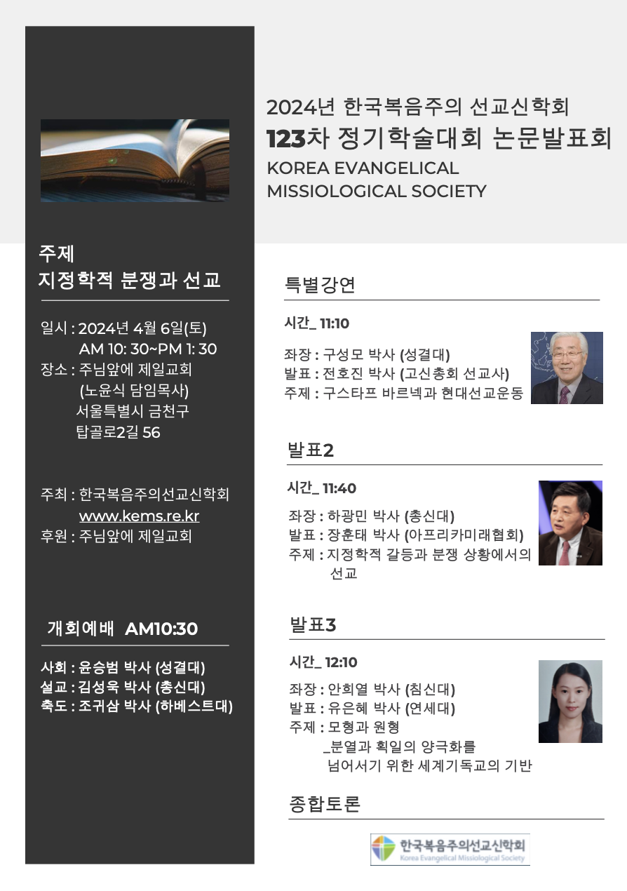 <지정학적 분쟁과 선교>라는 주제로 진행되는 이번 논문발표회는 전호진 박사(고신총회 선교사)가 '구스타프 바르넥과 현대 선교운동'이라는 제목으로 특별강연을 하며, 두 편의 연구논문이 발표된다.