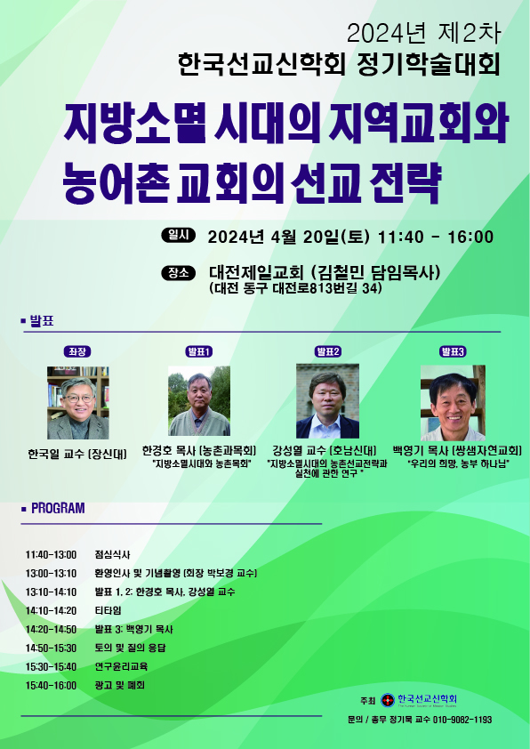 <지방 소멸 시대의 지역 교회와 농어촌 교회의 선교 전략>을 주제로 진행되는 이번 학술대회는 3편의 연구논문이 발표될 예정이다.