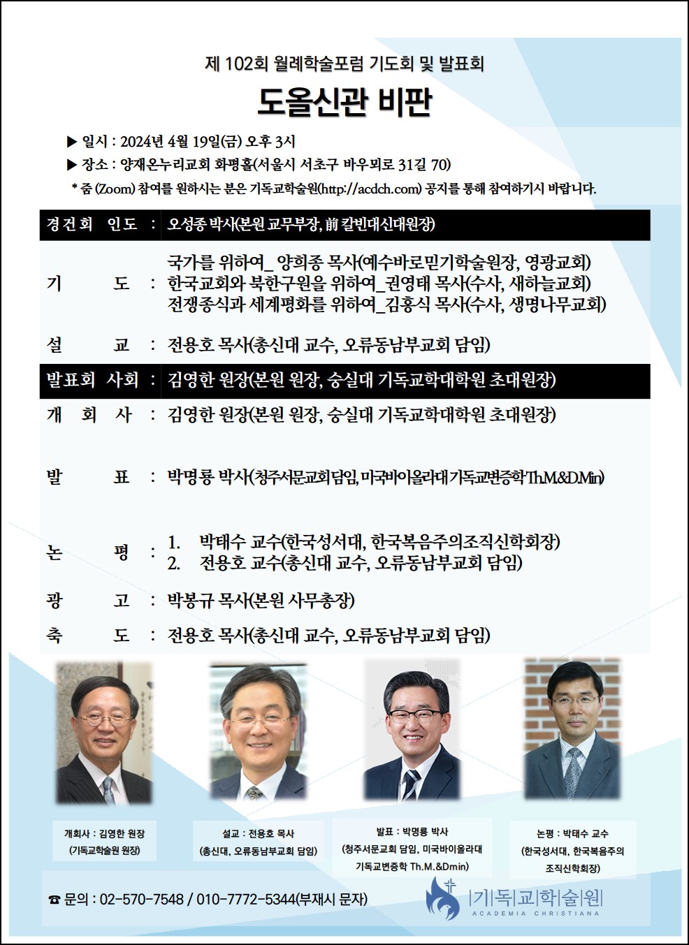 기독교학술원(원장:김영한 박사)이 오는 4월 19일(금) 오후 3시 양재 온누리교회 화평홀에서 제102회 월례학술포럼을 개최한다.