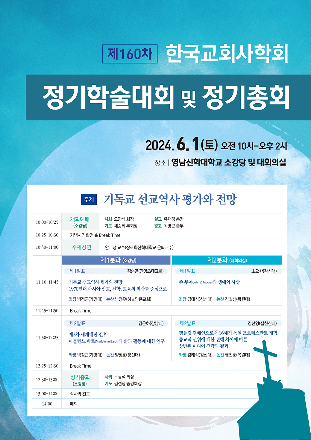 한국교회사학회(회장:오광석 박사, 감신대 교수)가 오는 6월 1일(토) 오전 10시 영남신대에서 제160차 학술대회 및 정기총회를 개최한다.