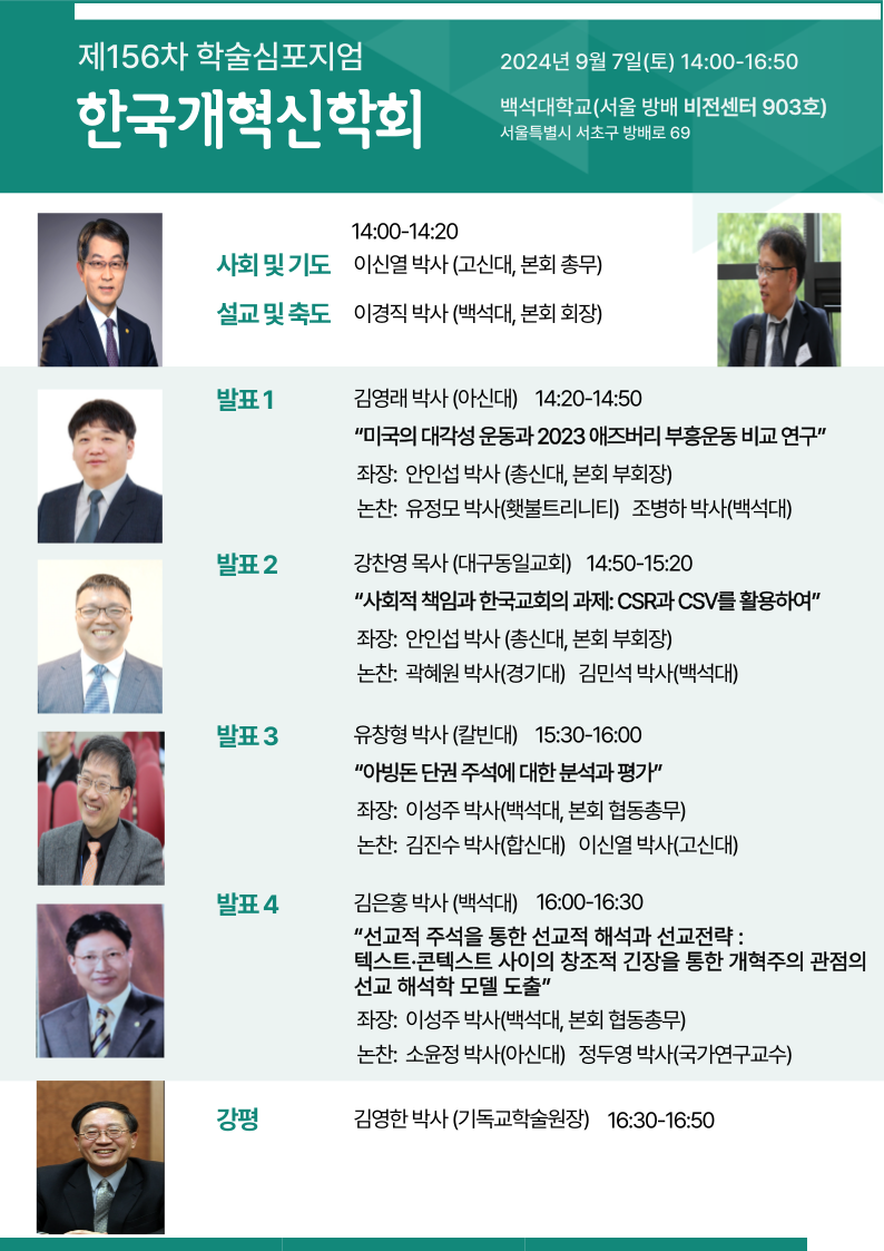 한국개혁신학회(회장:이경직 박사/백석대)가 오는 9월 7일(토) 오후 2시 서울 방배동에 위치한 백석대학교(비전센터 903호)에서 '제156차 학술심포지엄'을 개최한다.