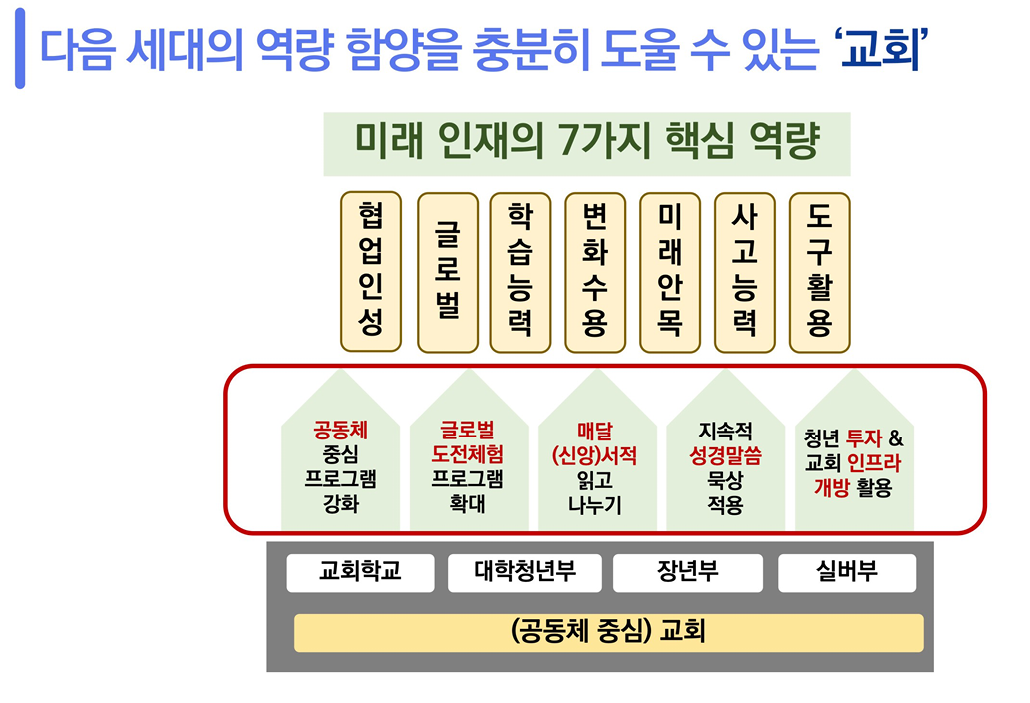 특히 "AI는 미래 직업의 생태계도 바꾸고 있다. 따라서 직업의 변화와 다음 세대에게 필요한 역량 교육에 더 큰 관심을 갖되, 교회는 공동체 중심, 성경 중심으로 다음 세대 양성을 위해 실질적인 투자를 해야 한다"라고 피력했다.