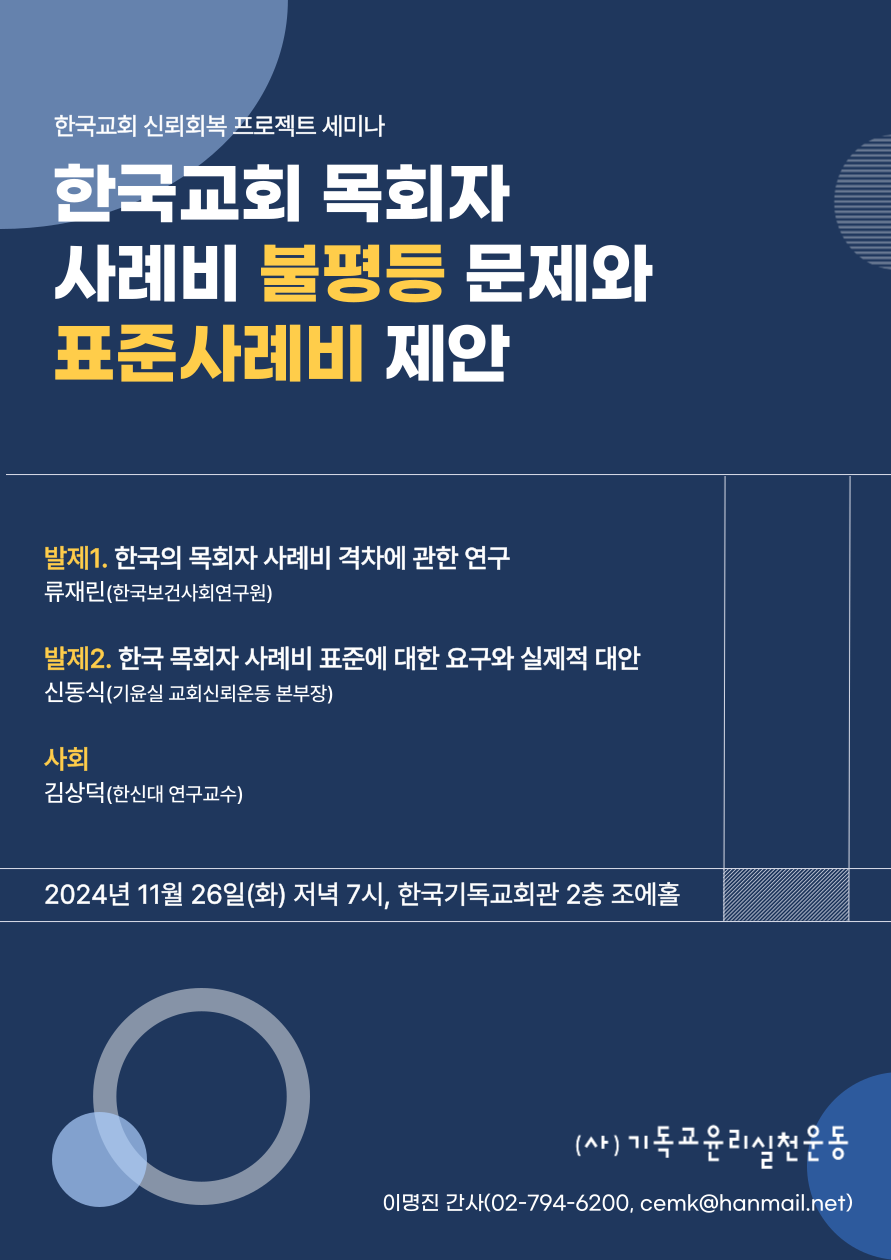 기독교윤리실천운동(이하 기윤실)이 오는 11월 26일(화) 오후 7시 한국기독교회관 2층 조에홀에서 한국 교회 목회자 사례비와 관련된 불평등 문제를 논의하면서 표준사례비를 제안할 예정이다.