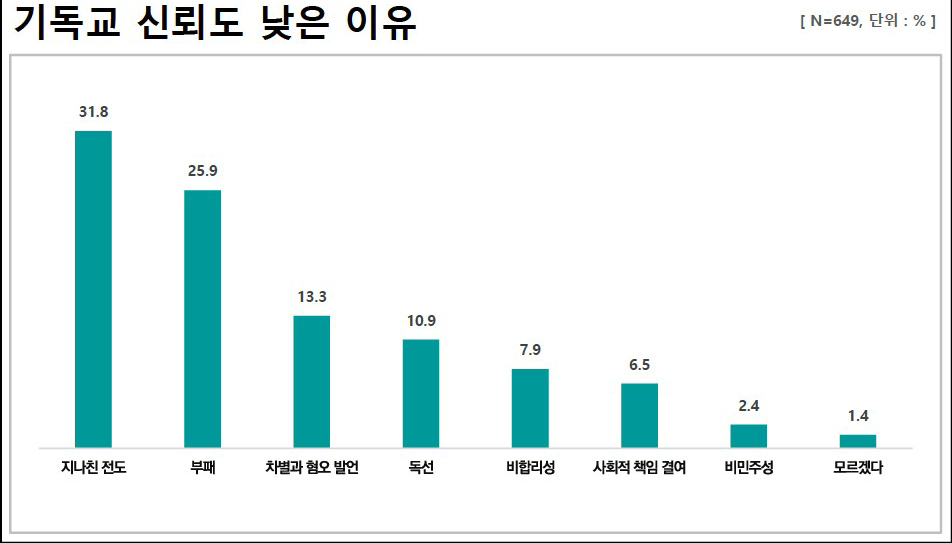 특히 개신교에 대한 사회적 신뢰도가 낮은 이유에 대해 비개신교인은 지나친 전도(31.8%), 부패(25.9%), 차별과 혐오 발언(13.3%), 독선(10.9%), 비합리성(7.9%), 사회적 책임 결여(6.5%), 비민주성(2.4%) 순으로 답했다.
