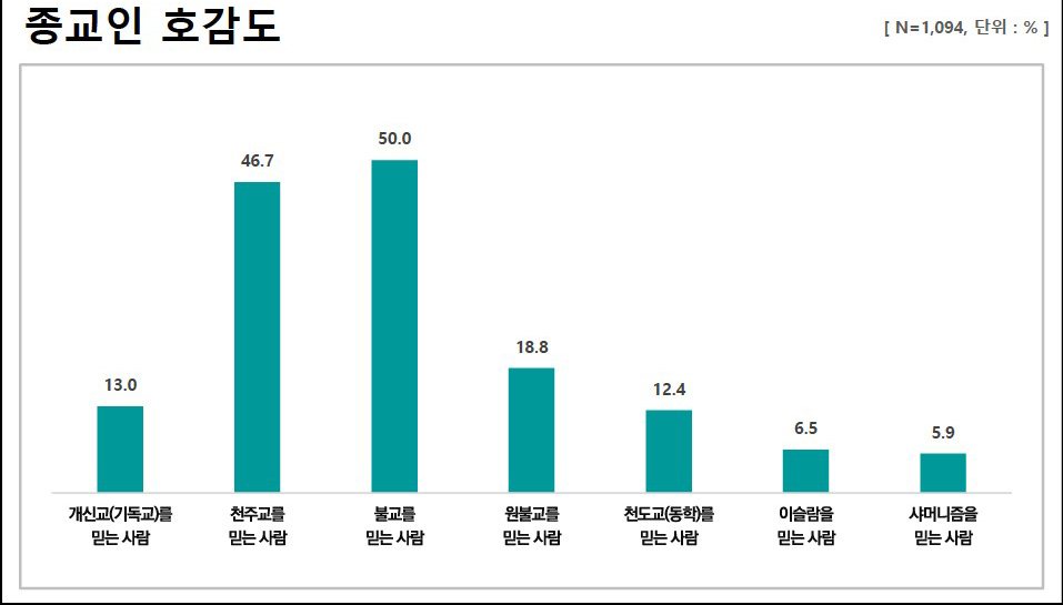 비개신교인의 종교 호감도는 불교(52.9%), 천주교(48.5%), 원불교(17.9%), 개신교(14.3%), 천도교(10.1%), 이슬람(5.9%), 샤머니즘(4%) 순으로 조사됐다.