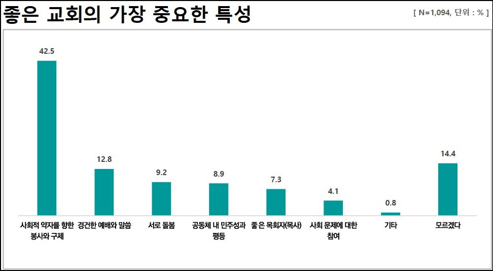 특히 ‘좋은 교회’의 가장 중요한 특성은 무엇인가에 대한 질문에 대해, 개신교인은 경건한 예배와 묵상(39.2%), 사회적 약자를 향한 봉사와 구제(25.9%), 서로 돌봄(12.6%), 좋은 목회자(10.2%), 공동체 내 민주성과 평등(6.4%), 사회문제에 대한 참여(1.7%) 순으로 답했다.