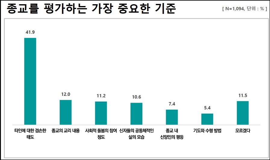비개신교인의 종교를 평가하는 가장 중요한 기준은 타인에 대한 겸손한 태도 (41.9%), 종교의 교리(12.0%), 사회적 돌봄(11.2%), 신자들의 공동체적인 삶의 모습(10.6%), 종교 내 신앙인의 평등(7.4%), 기도와 수행(5.4%) 순으로 답했다.