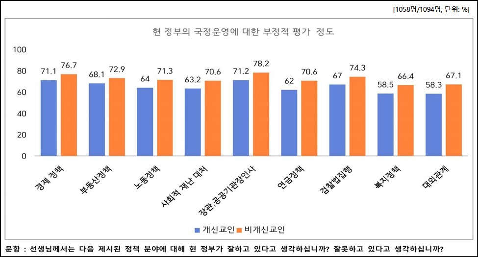 총 9개 분야별 국정운영 평가 조사 결과에 따르면, 각 분야별, 각각 개신교인과 비개신교인의 부정적 평가는 다음과 같다. ① 경제정책(조세, 재정, 물가) 71.1%, 76.7%, ② 부동산 정책 68.1%, 72.9%, ③ 노동정책 64.0%, 71.3%, ④ 사회적 재난 대처 63.2%, 70.6%, ⑤ 장관 및 공공기관장 인사 71.2%, 78.2%, ⑥ 연금정책 62.0%, 70.6%, ⑦ 검찰 법집행 67.0%, 74.3%, ⑧ 복지정책 58.5%, 66.4%, ⑨ 대외관계 58.3%, 67.1%로 부정적 평가가 두드러지게 나타났다.