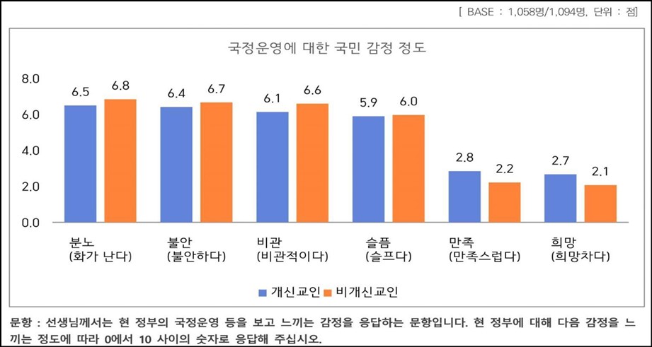 조사 결과 현 정부에 대해 느끼는 국민 감정 정도에서, 개신교인은 10점 만점에 분노 6.5점으로 가장 높고, 이어서 불안(6.4점), 비관(6.1점), 슬픔(5.9점), 만족(2.8점), 희망(2.7점) 순으로 나타났다.
