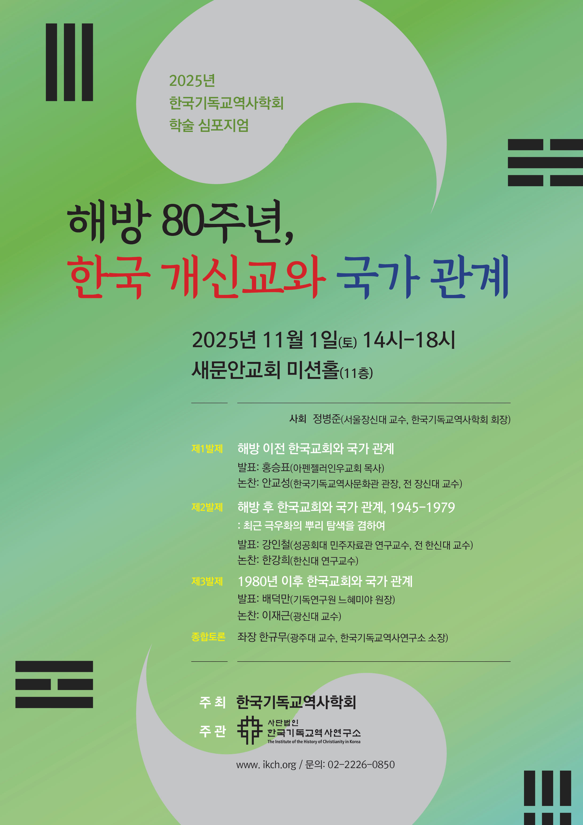 이번 학술 심포지엄은 <해방 80주년, 한국 개신교와 국가 관계>라는 주제로 진행되며, 홍승표 목사(아펜젤러인우교회), 강인철 박사(성공회대 민주자료관 연구교수), 배덕만 박사(기독연구원 느헤미야 원장) 등이 발제자로 나서 △해방 이전 한국 교회와 국가 관계, △해방 후 한국 교회와 국가 관계, 1945-1979(최근 극우화의 뿌리 탐색을 겸하여), △1980년 이후 한국 교회와 국가 관계 등을 주제로 발표할 예정이다.