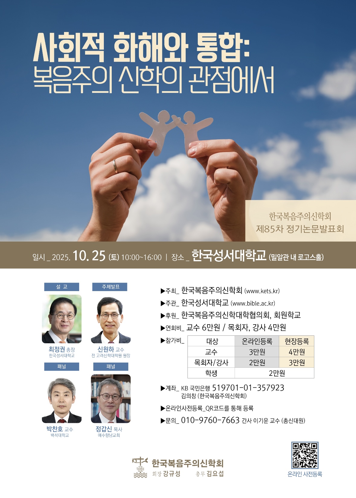한국복음주의신학회(회장:강규성 박사)가 오는 10월 25일(토) 오전 10시 한국성서대학교에서 제85차 정기논문발표회를 개최한다.