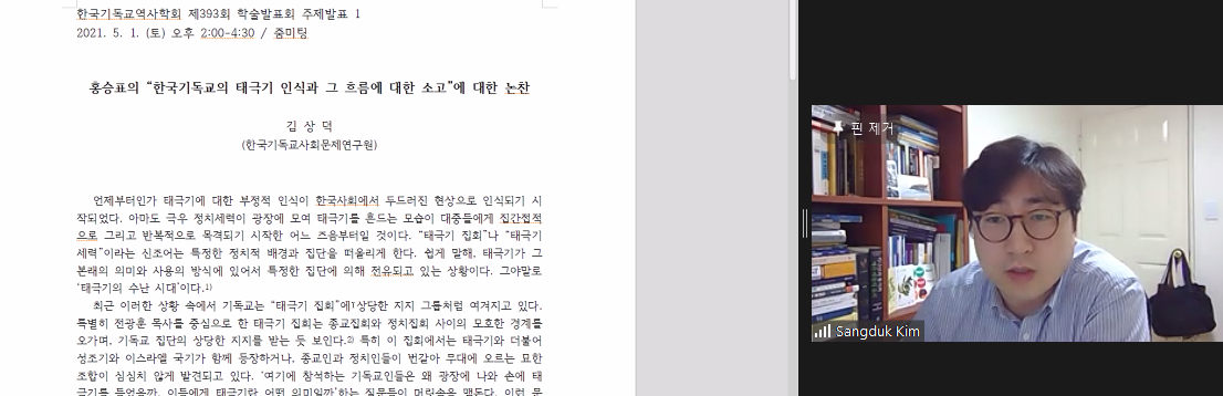 한편, 이날 홍승표 박사의 발표에 대해 논찬한 김상덕 연구실장(한국기독교사회문제연구원)은 "태극기에 대한 부정적 인식이 한국사회에서 두드러진 현상으로 인식되기 시작했다. 아마도 극우 정치세력이 광장에 모여 태극기를 흔드는 모습이 대중들에게 집간접적으로 그리고 반복적으로 목격되기 시작한 어느 즈음부터일 것"이라며 "'태극기 집회'나 '태극기 세력'이라는 신조어는 특정한 정치적 배경과 집단을 떠올리게 한다. 쉽게 말해, 태극기가 그 본래의 의미와 사용의 방식에 있어서 특정한 집단에 의해 전유되고 있는 상황"이라고 진단했다.