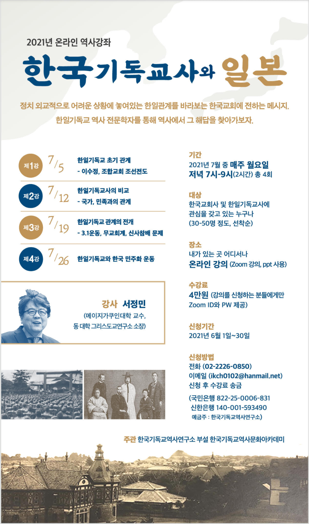 메이지가쿠인대학 교수인 서정민 박사(메이지가쿠인대학 그리스도교연구소장)가 강사로 나서며, 한국과 일본의 기독교사에 대해 집중 강의한다. 수강료는 4만원이다.