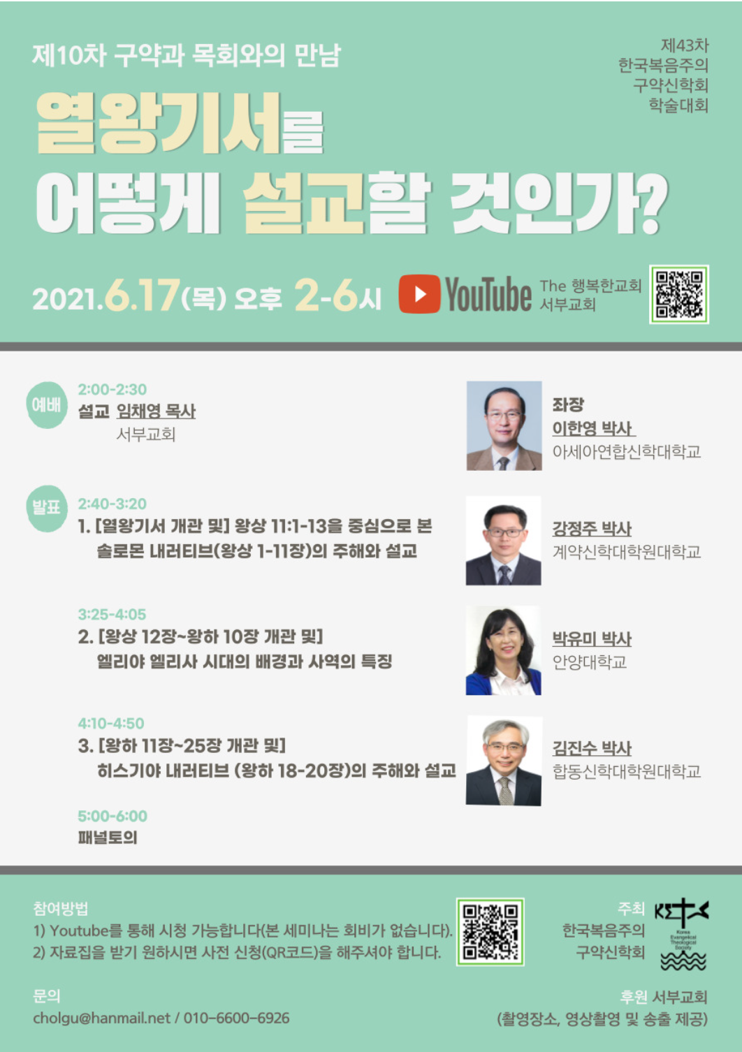 한국복음주의구약신학회(회장:김윤희 박사, 횃불신대)가 오는 6월 17일 오후 2시 유튜브로 '제10차 구약과 목회와의 만남 학술대회'를 개최한다.