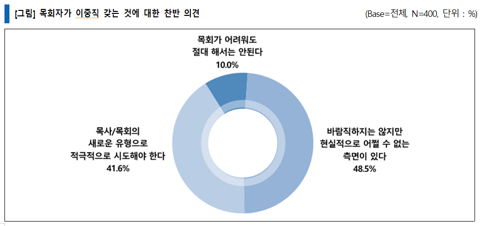 조사 결과, 목회자가 이중직을 갖는 것에 대한 찬반 여부를 묻는 질문과 관련해서 40.1%는 ‘목사/목회의 새로운 유형으로 적극적으로 시도해야 한다’가 40.1%, ‘바람직하지 않지만 현실적으로 어쩔 수 없는 측면이 있다’가 49.4%로 찬성 의견이 89.6%로 절대적으로 높은 것으로 나타났다.