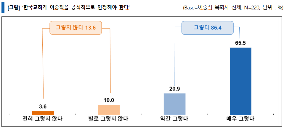 조사 결과, 이중직 목회자들의 86.4%는 '한국교회가 이중직을 공식적으로 인정해야 한다'라고 응답하는 등 대다수의 이중직 목회자들은 이중직에 대한 공식 허용이 필요하다고 인식하고 있는 것으로 조사됐다.