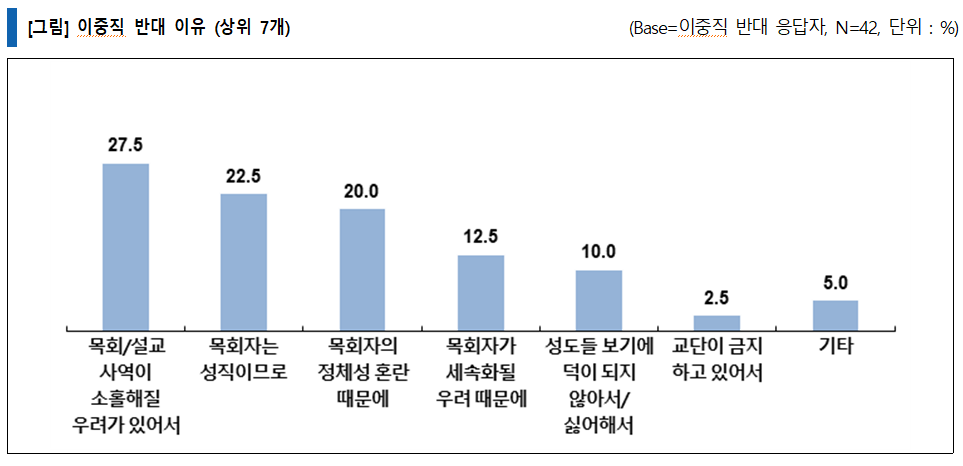 조사 결과, 이중직을 반대하는 이유를 물은 결과 ‘목회/설교 사역이 소홀해질 우려가 있어서’(28.2%)와 ‘목회자가 세속화될 우려 때문에’(12.7%)라는 목회의 현실성과 ‘목회자는 성직이므로’(22.5%)와 ‘목회자의 정체성 혼란 때문에’(18.9%)와 같은 목회자의 정체성 두 차원으로 나누어졌다.