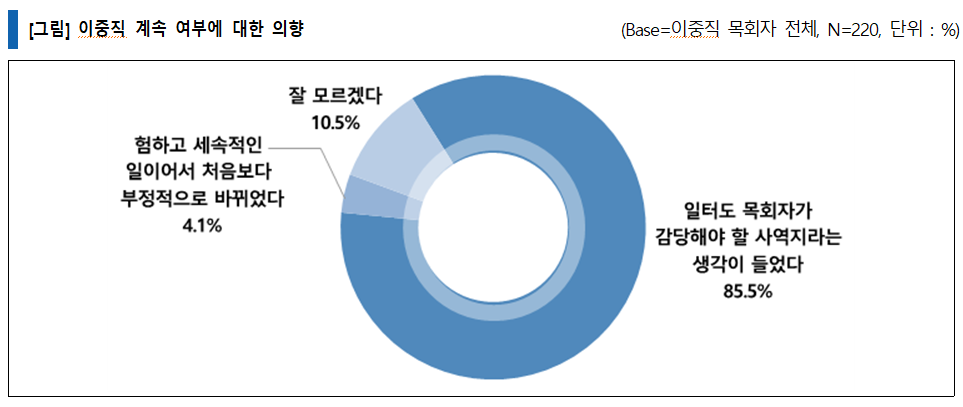 이와 관련 목회데이터연구소는 "이들은 이중직을 단순 생계 수단으로 생각한 경우와 육체적으로 힘들었던 경우일 수 있다"라며 "‘교회 재정과 상관없이 이중직을 계속하고 싶다‘고 응답한 39.5%는 이중직을 단순 생계 수단 이상의 목회로 인식하는 것으로 해석할 수 있다"라고 설명했다.