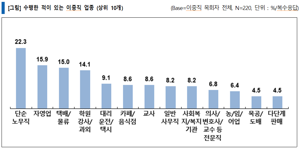 조사 결과, 이중직 목회자들이 가장 많이 선택한 일은 ‘단순 노무직’(22.3%였)으로 나타났다. 이어 ‘자영업’(15.9%), ‘택배/물류’(15.0%), '학원강사/과외'(14.1%)를 응답했고, ‘대리운전/택시’(9.1%), ‘카페/음식점’(8.6%), ‘교사’(8.6%), ‘사회복지/복지기관 근무’(8.2%), ‘일반 사무직’(8.2%), ‘농/임/어업’(6.4%)은 10% 이하였다.