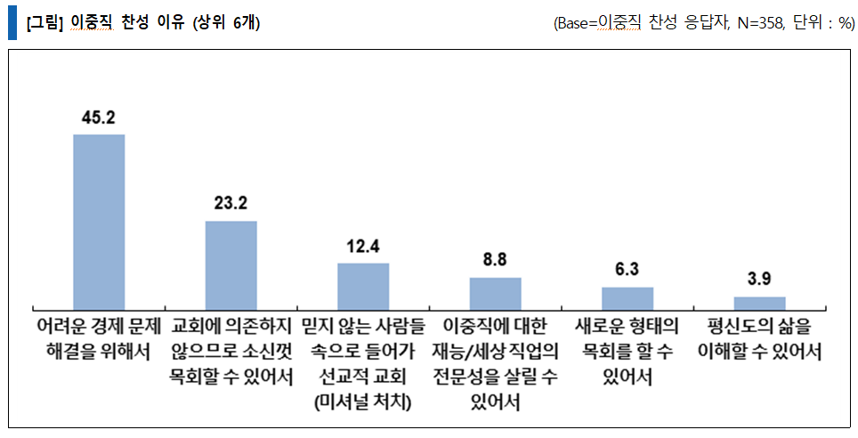 하지만 이중직을 찬성하는 358명의 목회자들의 응답을 보면 '경제 문제 해결'이 가장 높았다.