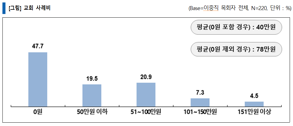 분석결과에 따르면 이중직 목회자(220명) 가운데 교회로부터 사례비를 받지 못하는 경우가 거의 절반에 가까운 47.7%로 나타났다. 50만 원 이하는 19.5%, 51~100만 원이 20.9%로 조사됐다. 반면, 월 100만 원 이상 받는 비율이 11.8%에 불과했다.