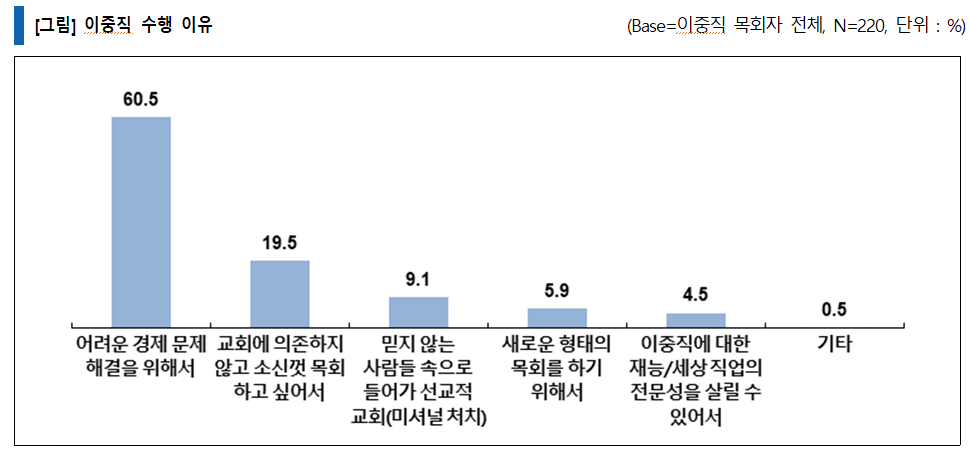 특히 현재도 이중직을 수행하는 비율은 37.1%로 나타났는데, 연령으로는 40대 이하(37.6%)에서 가장 높았으며, 출석 교 인 수로는 20명 이하 교회 목회자에서는 33.7%, 21~50명 교회 목회자에서는 25.7%로 나타나는 등 교회 규모가 작을수록 경제적으로 더 절박하다는 것을 보여줬다.