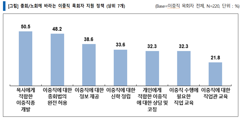 이중직 목회자들의 대부분은 '이중직 목회자를 위해 총회와 노회로부터 지원이 필요하다는 견해(89.5%)를 갖고 있었으며, 목사 이중직에 적합한 직종 정보 제공과 이중직에 대한 신학적/법적 뒷받침이 필요하다는 인식을 하고 있는 것으로 나타났다.