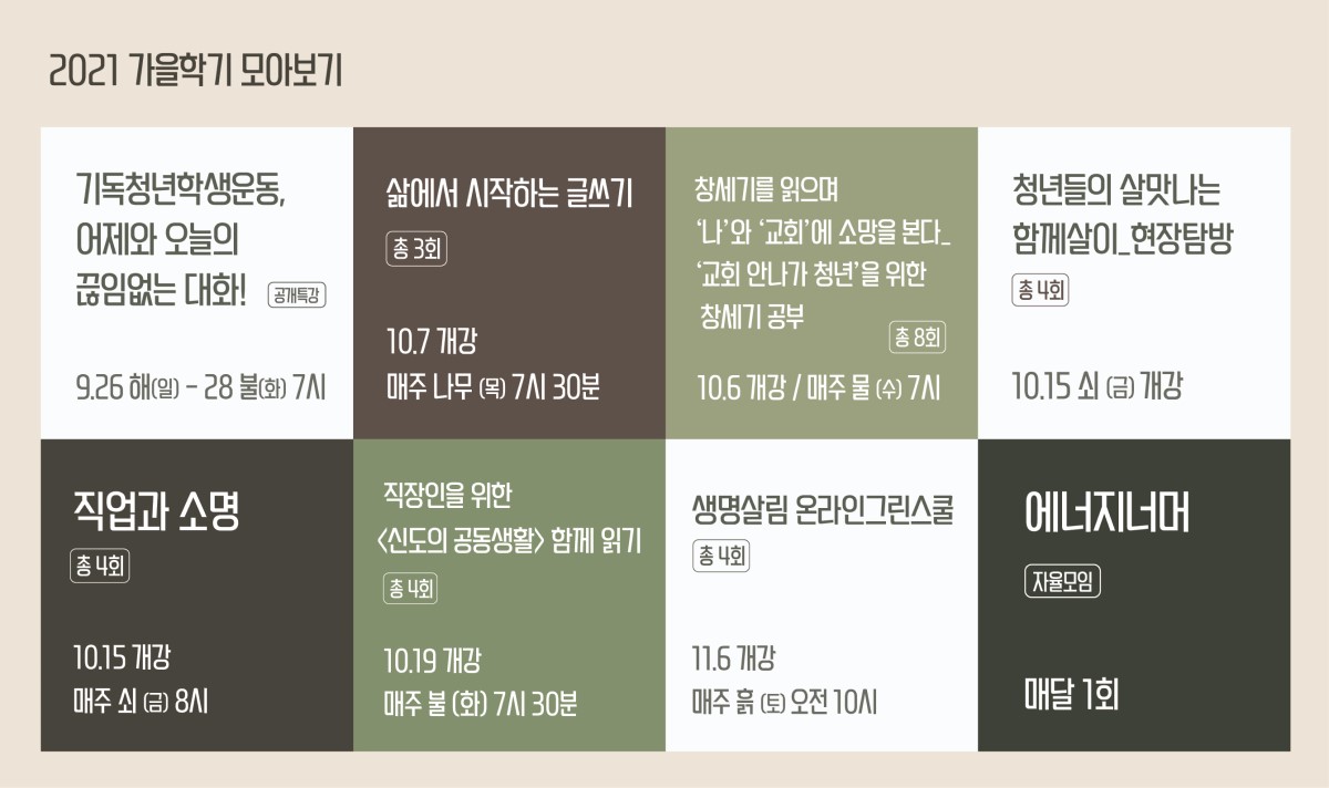 이번 가을학기는 공개특강인 <기독청년학생운동, 어제와 오늘의 끊임없는 대화!>를 시작으로 삶에서 시작하는 글쓰기(3회) △'교회 안나가 청년'을 위한 창세기 공부(8회) 청년들의 살맛나는 함께살이_현장탐방(4회) 직업과 소명(4회) 직장인을 위한 <신도의 공동생활> 함께읽기(4회) 생명살림 온라인그린스쿨(4회) 에너지너머-자율모임(월1회) 등으로 진행된다.