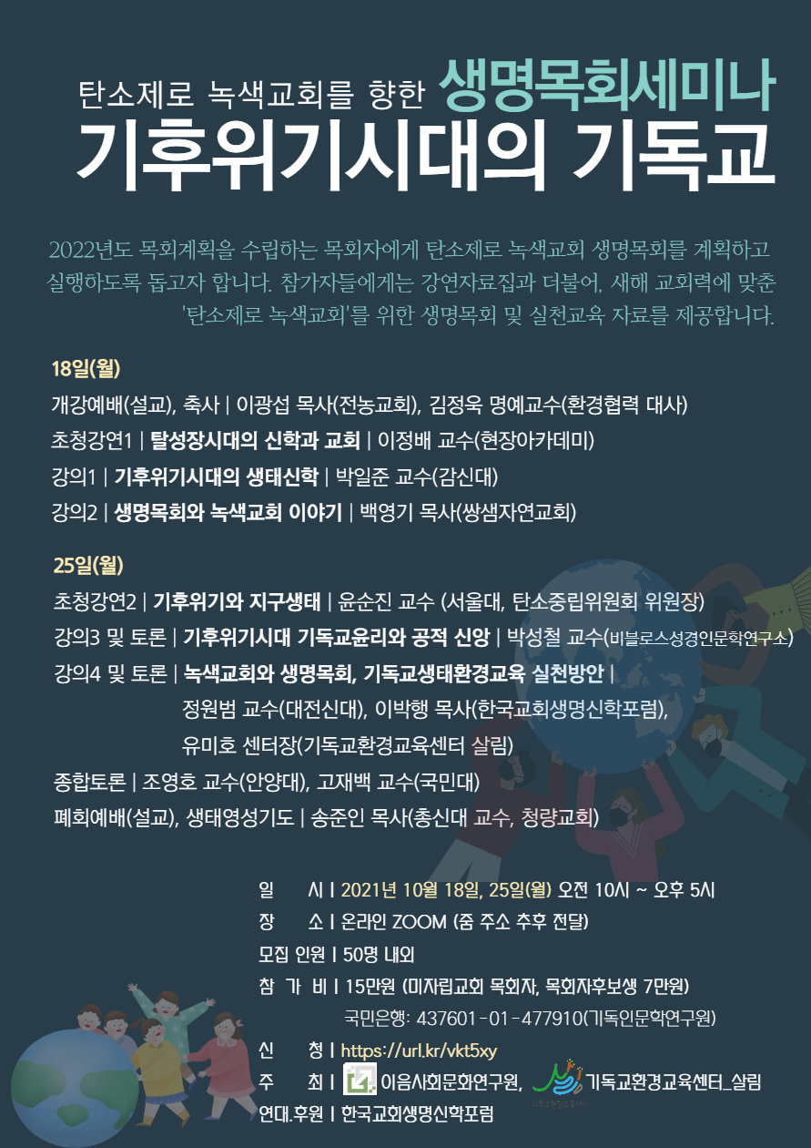 이음사회문화연구원과 기독교한경교육센터 살림은 오는 10월 18일(월), 25일(월) 오전 10시부터 오후 5시까지 온라인, ZOOM으로 '기후위기 시대의 기독교'를 주제로 '탄소제로 녹색교회를 향한 생명목회 세미나'를 진행한다.