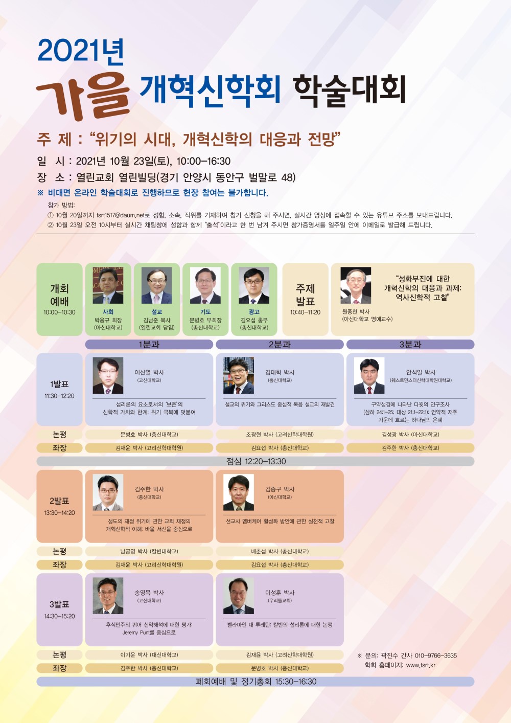 개혁신학회(회장:박응규 박사/아신대)가 오는 10월 23일(토) 오전 10시 열린교회 열린빌딩(온라인 ZOOM)에서 '위기의 시대, 개혁신학의 대응과 전망'을 주제로 가을학술대회를 개최한다.