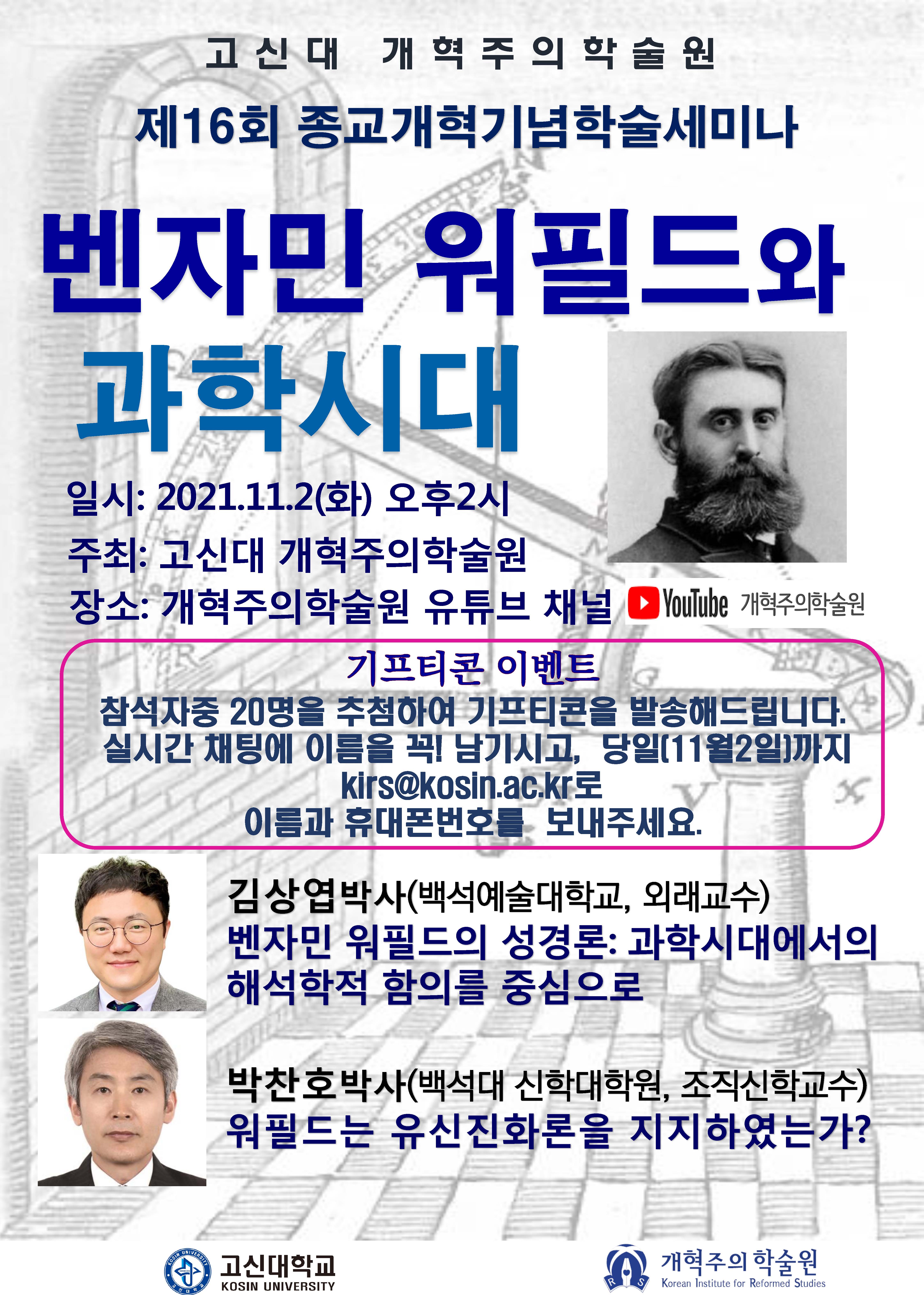 고신대 개혁주의학술원(원장:이신열 박사)이 오는 11월 2일(화) 오후 2시 '벤자민 워필드와 과학시대'를 주제로 제16회 종교개혁기념학술세미나'를 개최한다.