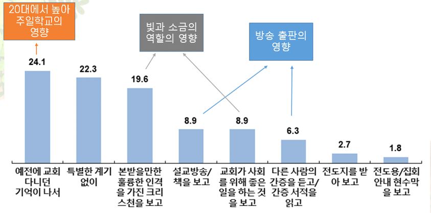 20대 이하는 ‘가족/친척’(37.7%) 외에 ‘친구/선후배’(33.3%) 비율이 다른 연령대보다 2배 이상 높았으며, 40대는 ‘자발적으로’(31.0%) 교회에 나온 비율이 상대적으로 높게 나타났다. 특히 60대 이상은 ‘이웃’(25.0%)의 전도로 나온 비율이 높아 지역 사회의 전도가 효과적으로 작용한 것으로 보인다고 평가할 수 있다.