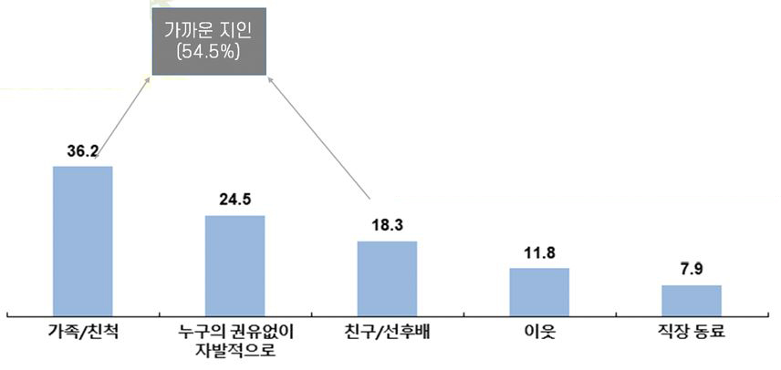 전도자는 누구였는지 관련해서는 남성은 ‘가족/친척’이 전도한 경우가 43.6%로 거의 절반에 가까울 정도로 많은데, 여성은 ‘가족/친척’(29.1%)뿐만 아니라 ‘자발적으로’(28.1%) 교회를 나온 비율도 높았다.