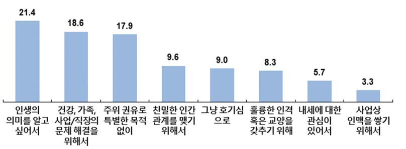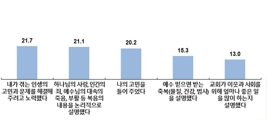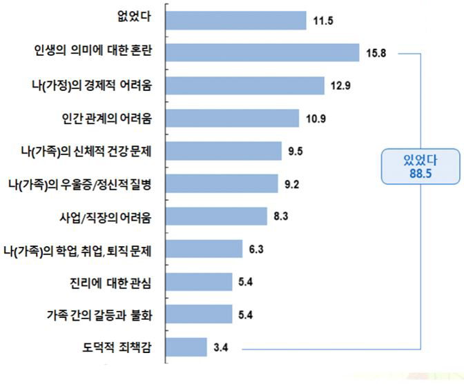 신앙에 관심을 갖게 된 이유와 관련해서는 삶의 고난이 신앙에 관심을 끌게 하는 영향력이 매우 크다는 것으로 나타났다. 이 중 삶의 고난 가운데 신앙에 관심을 끌게 한 문제로 가장 많이 응답한 것은 ‘인생의 의미에 대한 혼란’(15.8%)이었다.