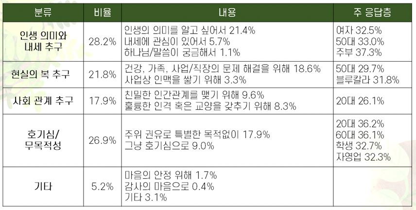 교회 출석 목적과 관련해서는 여성(25.1%)이 남성(17.6%)보다 ‘인생의 의미를 알고 싶어서’ 교회를 출석한 경우가 많았으며, 주부(30.5%)가 결혼 후 가정에 매몰되거나 상실감을 극복하기 위한 것으로 나타났다.