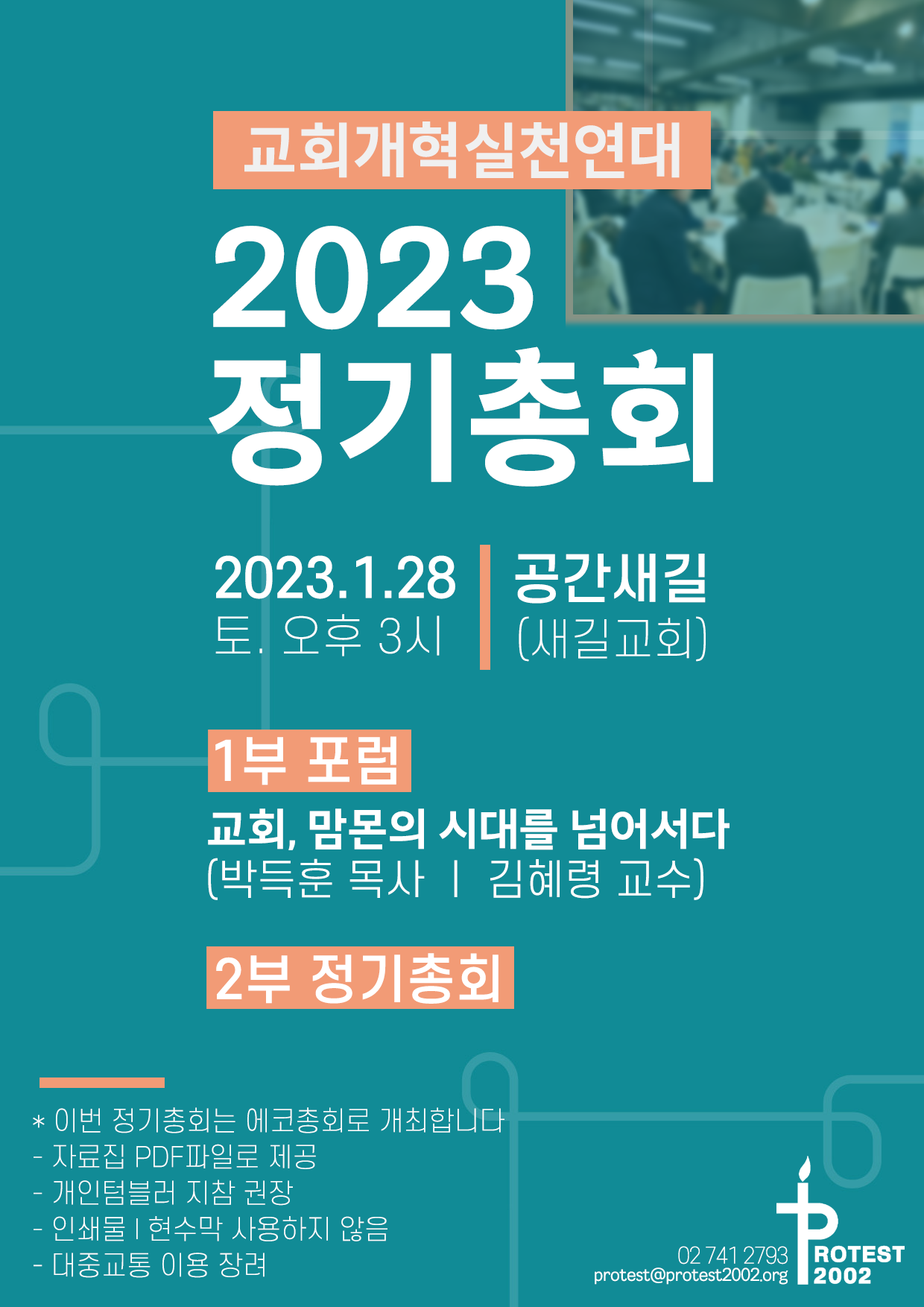 교회개혁실천연대(공동대표:남오성∙윤선주∙임왕성∙최갑주, 이하 개혁연대)가 오는 1월 28일(토) 오후 3시 공간새길(서울 중구 통일로 1145 바비엥2 지하1층 101호)에서 <2023년 정기총회 및 포럼>을 개최한다.