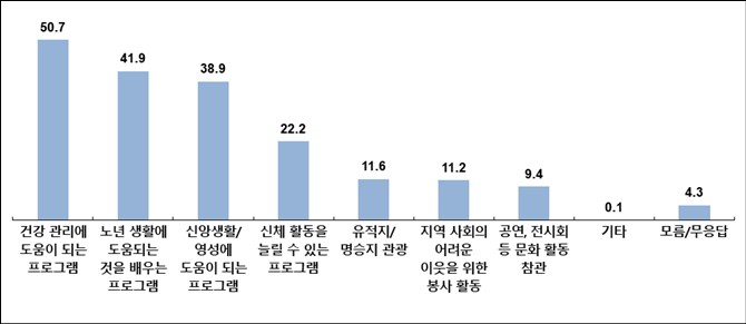 고령 교인들이 교회에 바라는 점은 ‘같은 나이대 교인들과의 교제/소그룹 활동’이 46.9%로 가장 많았다. 그 다음으로는 ‘여가시간 활용을 위한 프로그램 제공’(35.4%), ‘목회자의 관심과 연락’(27.2%), ‘교회 도움이 될 수 있는 활동/사역 기회 부여’(24.1%), ‘사회에 도움을 줄 수 있는 활동 기회 제공’(22.6%)으로 나타났다.