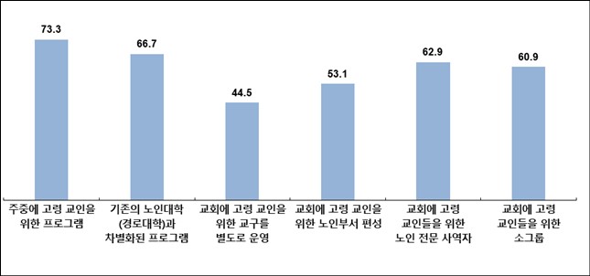 고령 교인을 위한 프로그램을 제시하고 각각의 프로그램에 대한 필요성을 질문했을 때, ‘주중에 고령 교인을 위한 프로그램’이 필요하다는 응답이 73.3%로 가장 많았다. 다음으로는 ‘고령 교인을 위한 노인 전문 사역자’(62.9%), ‘고령 교인들을 위한 소그룹’(60.9%)를 많이 응답했다.