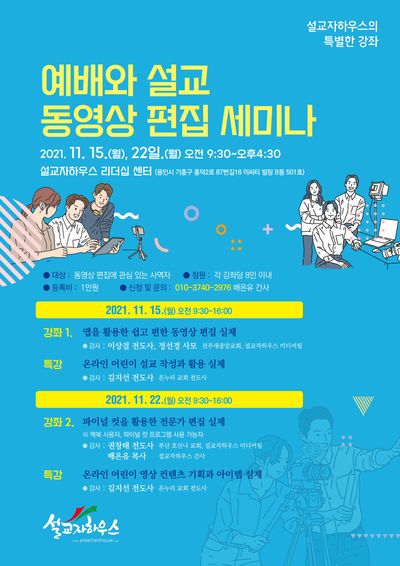 설교자하우스(대표:정창균 박사)가 오는 11월 15일(월), 22일(월) 설교자하우스 리더십센터에서 '예배와 설교 동영상 편집 세미나'를 개최한다.